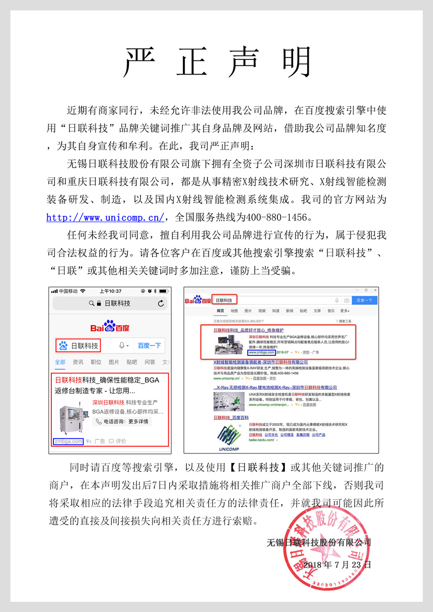 關于使用“日聯科技”品牌關鍵詞的嚴正聲明