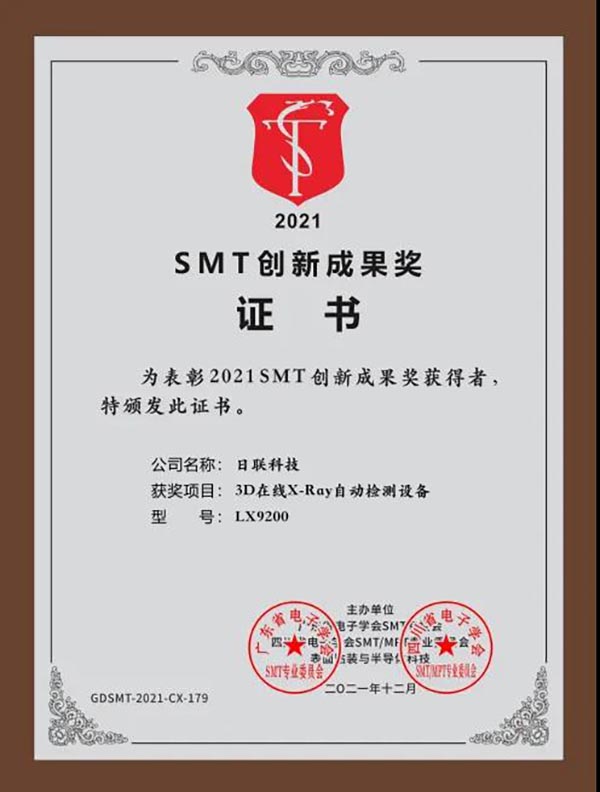 在中國SMT創新成果頒獎典禮上,日聯科技研制的LX9200在線X射線自動檢測裝備憑借重大技術創新點及行業專家學者一致評定,榮獲“2021中國SMT創新成果獎”,這也是日聯科技連續12年獲得該獎項。