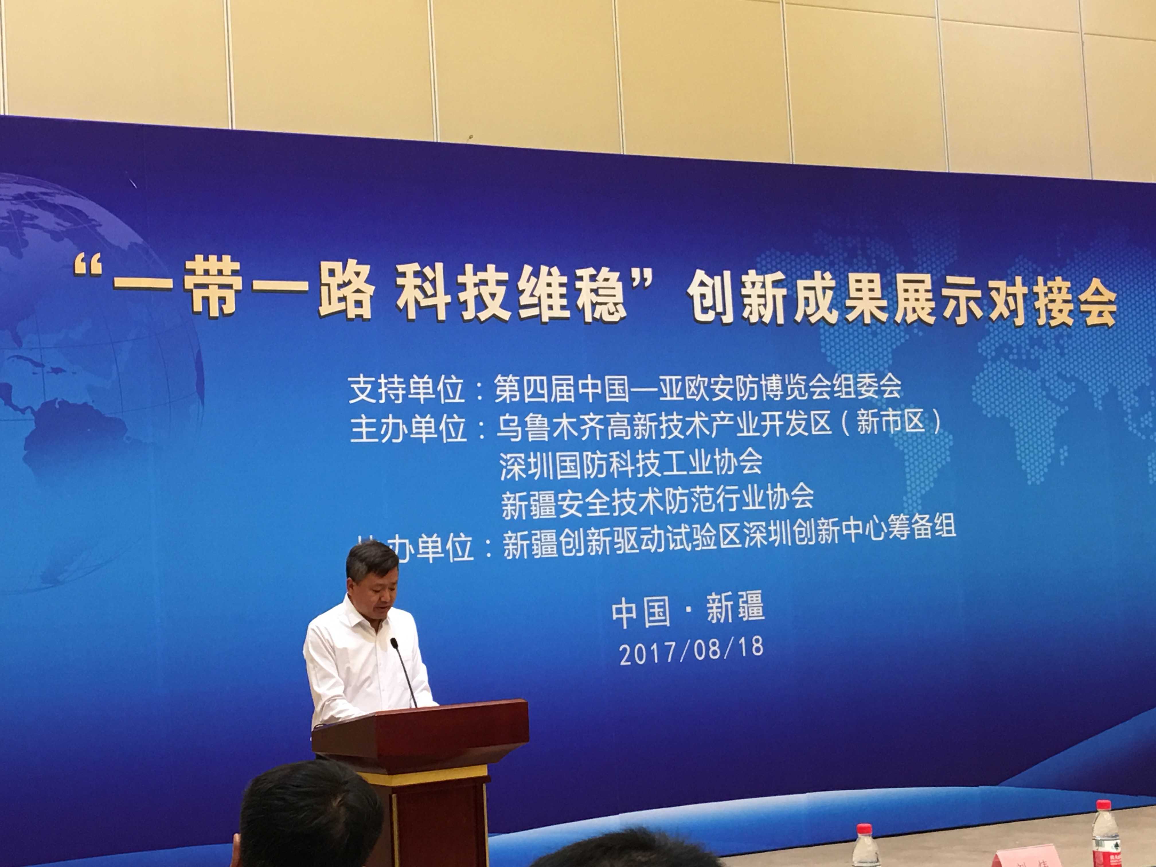 展會期間,烏魯木齊高新區(新市區)政府協同深圳國防科技工業協會、新疆安防協會,于8月18日在會展中心5樓多功能廳聯合舉辦了“一帶一路·科技維穩”創新成果展示對接會。自治區政法委、公安廳及監獄局等領導、深圳對口援疆前方指揮部領導、陸軍邊海防學院烏魯木齊校區相關專家、烏魯木齊公安政法系統相關主管部門以及行業協會、深圳22家軍民融合高新技術企業負責人等150多人進行了交流對接。日聯科技董事長劉駿先生代表深圳22家企業向參會領導發言表態,將持續向反恐一線提供高、精、尖、端反恐技術及裝備產品并全力配合國家及自治區政府打好反恐維穩人防及技防的“組合拳”,奪取反恐維穩斗爭的全面勝利。