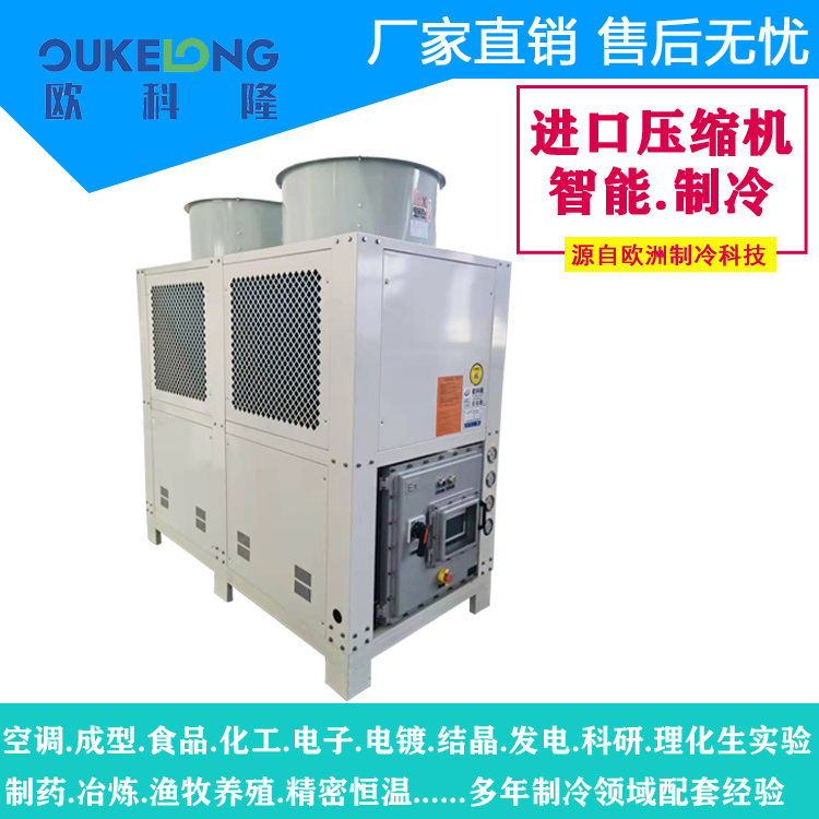 風(fēng)冷箱式防爆冷水機(jī),是歐科隆制冷打開市場(chǎng)的拳頭產(chǎn)品,歐科隆制冷擁有廣泛的防爆冷水機(jī)配套經(jīng)營(yíng),包括臭氧發(fā)生器,甲烷發(fā)電,化工化纖,石油天然氣,新型環(huán)保行業(yè)等,歐科隆防爆冷水機(jī)采用隔爆、增安、本安、正壓、充油、充砂、無火花、澆封和氣密等多種防爆方式,使機(jī)組可以在易燃易爆場(chǎng)合使用。