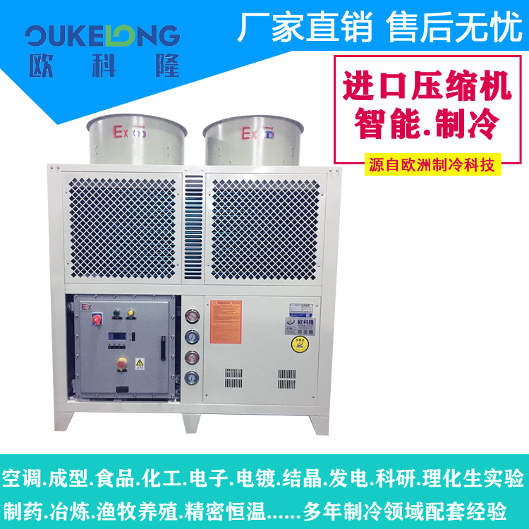 歐科隆15匹防爆冷水機(jī)專為化工、制藥、鋰電池等易燃易爆環(huán)境研發(fā),通過(guò)國(guó)家Ex dⅡBT4防爆認(rèn)證,整機(jī)采用防爆壓縮機(jī)、防爆電控系統(tǒng)及無(wú)火花元件,確保危險(xiǎn)場(chǎng)所安全運(yùn)行,為關(guān)鍵生產(chǎn)流程提供可靠制冷保障。